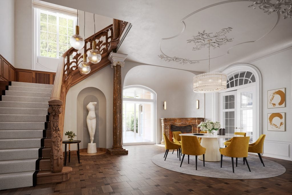 Architekt Christian Mussler und Investor Fabian Bohne verfolgen einen Ansatz, der Vergangenheit und Gegenwart nicht gegeneinander ausspielt, sondern miteinander verzahnt. „Wir restaurieren nicht, wir interpretieren“, sagt Mussler – und genau das wird spürbar: Die historische Fassade bleibt erhalten, ebenso Stuckdecken, klassische Fensterformate und alte Holztüren. Gleichzeitig entstehen lichtdurchflutete Räume mit hohen Decken, edlem Eichenparkett und moderner technischer Ausstattung. Wo einst repräsentative Salons lagen, entstehen heute großzügige Wohnbereiche, die Offenheit und Privatsphäre mühelos verbinden.