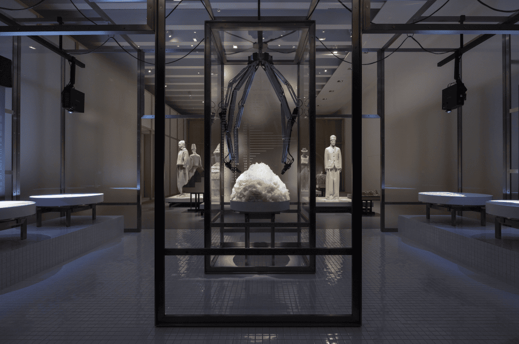 Drei Räume sind exklusiv Fasern aus dem Familienerbe gewidmet: Kaschmir, Leinen und Merinowolle. Der The Gift of Kings® Raum präsentiert ein fließendes Kleid in ikonischem Kummel Red, das nicht nur optisch beeindruckt, sondern auch mit wasserabweisender Funktionalität überrascht. Die Distel, Werkzeug der Stoffveredelung und gleichzeitig Symbol der Maison, bildet das Herzstück des zweiten Ausstellungsteils. Eine originale Distelmaschine aus Italien, mit kunstvoll geschnitzten Elementen des Londoner Handwerkers Jim Patrick, steht hier im Mittelpunkt. Fliesen und eine mit Distelmotiven verzierte Kuppel ergänzen das Tableau.