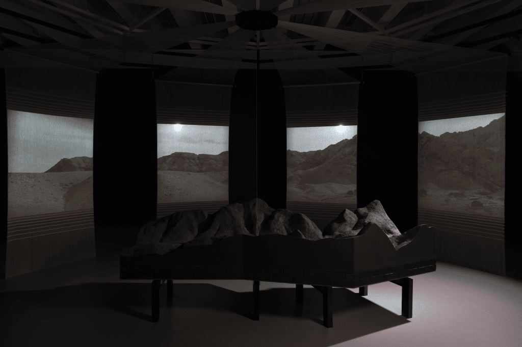 Zum Finale lädt ein überdimensionales Sofa aus Kaschmir – designt von Cini Boeri – zum Verweilen ein. Hier entfaltet sich „Mappa Mundi“ des chinesischen Künstlers Qui Zhijie: ein sechs Meter langes Werk über kulturellen Austausch zwischen China und Italien. Begleitet wird das Ganze von einer eigens komponierten Klanglandschaft aus Klavier, Bambusflöte und orchestralen Elementen, die die textilen Rhythmen der Ausstellung musikalisch umsetzen.