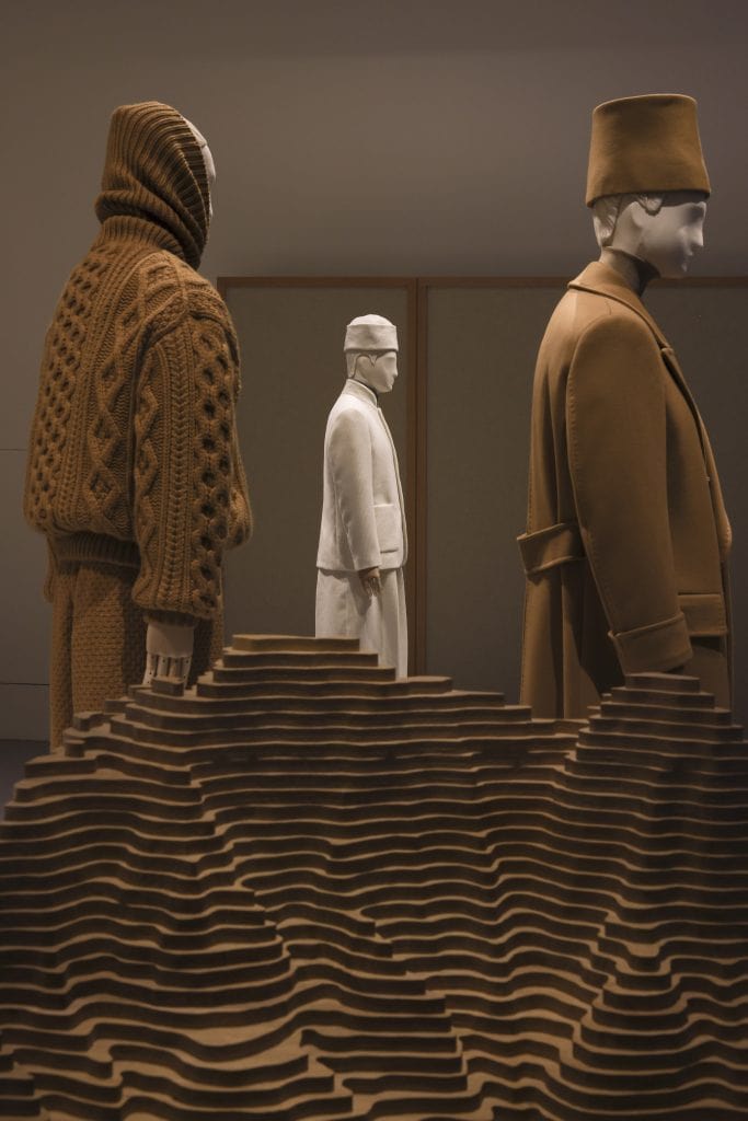 Ein weiterer Schwerpunkt liegt auf den Herkunftsregionen der edelsten Materialien. Miniaturlandschaften aus China, Japan, den Anden, Neuseeland und Frankreich verdeutlichen die Vielfalt und Einzigartigkeit der Fasern. Inmitten gepolsterter Wände und weicher Teppiche eröffnen sich textile Landschaften, begleitet von technischen Daten zu Habitat, Höhenlage und Luftfeuchtigkeit. Skulpturale Modeobjekte interpretieren die Rohstoffe in kunstvolle Silhouetten – darunter ein von Hand gefertigter Kaschmirrock mit Seidenfransen, ein dreiteiliger Anzug aus Hopsack-Wolle oder ein Ensemble aus Solaire-Leinen mit halbmondförmiger Plissierung.