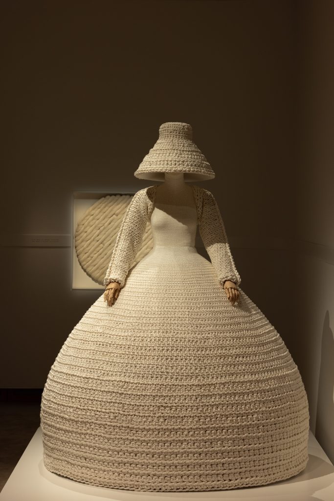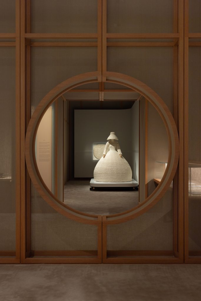 Ein weiteres Highlight: ein opulenter Reifrock und ein Hut mit kunstvoller Stickerei aus Baumwolle und Seidenchiné – verziert mit 124.000 Glasperlen und 59.000 Pailletten, Ergebnis einer über 1.000-stündigen Stickarbeit. Die Ausstellung endet mit einem immersiven Film, der die Landschaften und Arbeitsprozesse in Valsesia zeigt. Die textilen Displays, gefertigt aus Loro Piana Stoffen, erlauben einen Blick hinter die Kulissen, indem sie Einblicke in Kett- und Schussfäden geben.