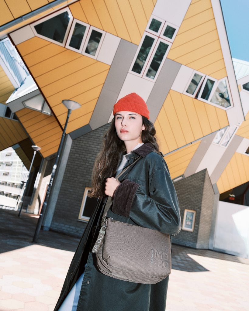 Für die Saison Herbst/Winter 2025 richtet Mandarina Duck den Blick nach Rotterdam – eine Stadt, in der Architektur, Experiment und Wandel ineinandergreifen. Die Kollektion versteht sich als Hommage an die kreative Energie der niederländischen Metropole und erzählt von einer Reise, die intelligent, stilvoll und bewusst erlebt wird. Zwischen den ikonischen Cube Houses von Piet Blom, der schwebenden Eleganz der Erasmusbrücke und dem gläsernen Depot Boijmans Van Beuningen spiegelt sich eine Stadt, die den Mut zur Moderne lebt und zugleich ihre Geschichte ehrt.