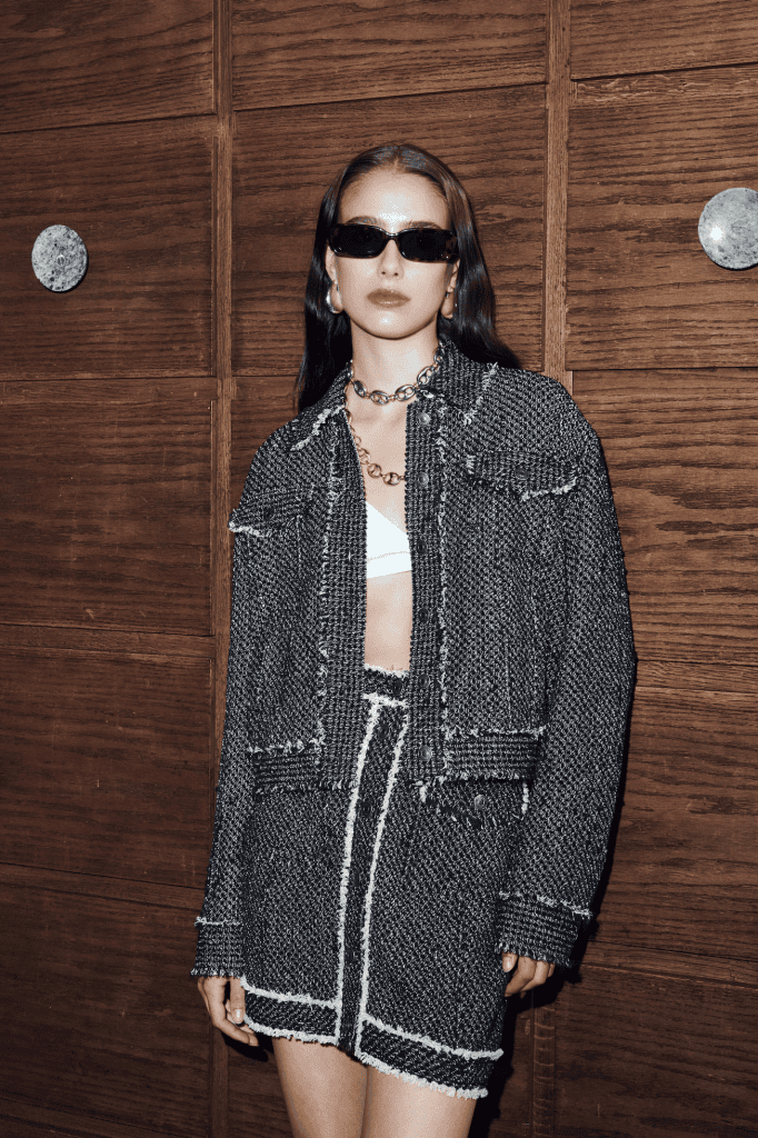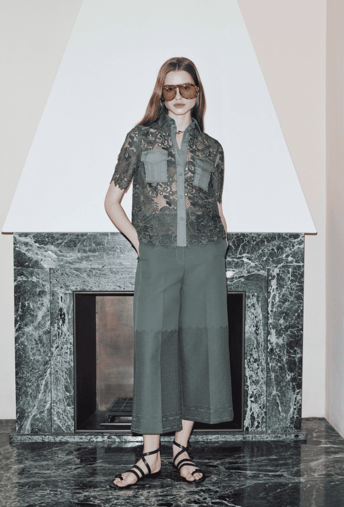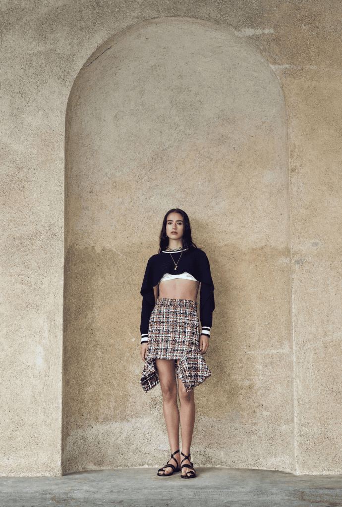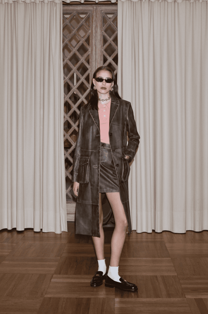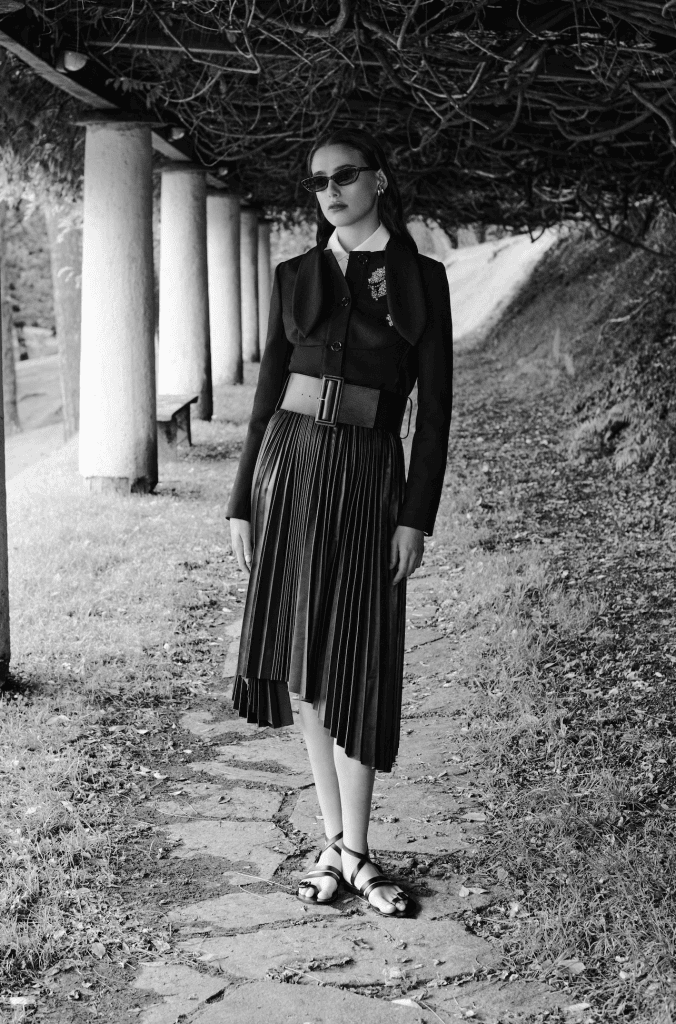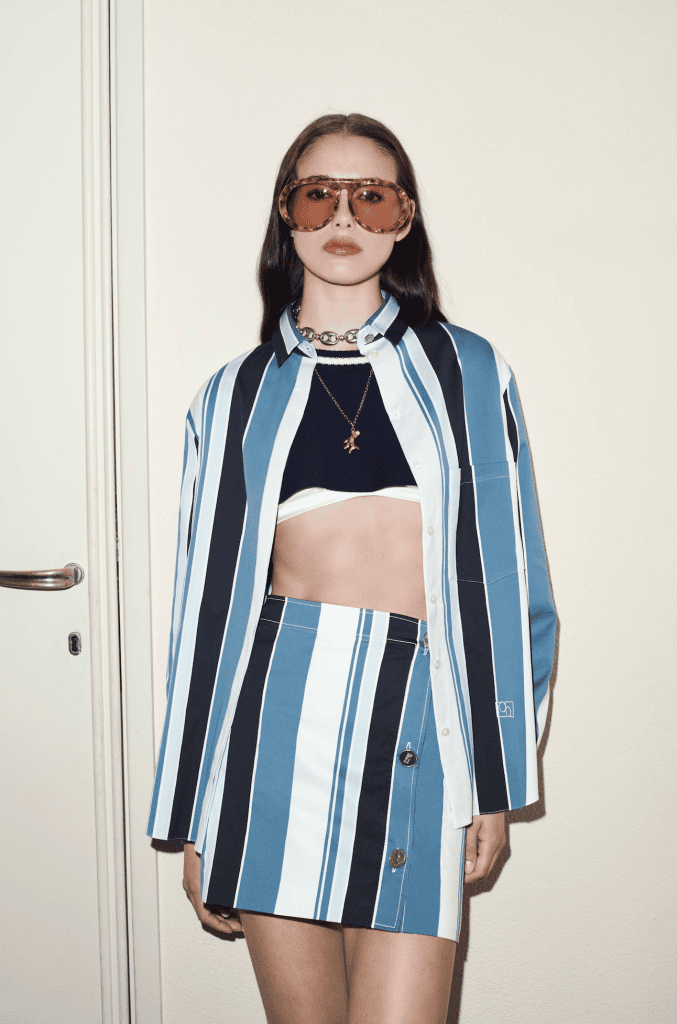Die Farbpalette dieser Saison spiegelt den italienischen Lebensstil wider und reicht von natürlichen bis hin zu raffinierten, lebhaften Tönen. Sanfte Weißnuancen stehen für Luxus und Reinheit, während tiefe Blautöne den ruhigen Himmel und das mediterrane Meer widerspiegeln. Lebhafte Rot-, Gold-, Gelb- und Orangetöne erinnern an die Wärme und den Charme der Amalfiküste, während satte Grüntöne die üppigen Landschaften Italiens einfangen. Zu den herausragenden Looks dieser Saison gehören ein langes, ärmelloses Merinokleid mit asymmetrischem Saum und subtilen kontrastierenden Logo-Details, ein eleganter, hellblauer, knielanger Ledermantel mit Rüschen und ein schwarzes langärmeliges Kleid mit rauen Kanten, verziert mit einem auffälligen goldenen Korallenprint. Diese Designs sind von ikonischen italienischen Städten inspiriert. Eine weitere frische Interpretation klassischer Strandkleidung bietet die Kombination aus blau gestreiftem Hemd und Farbverlauf-Rock.